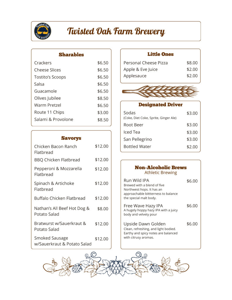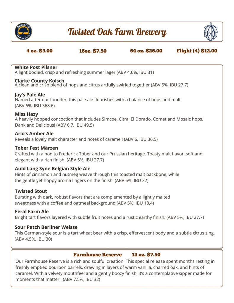 Nestled in the heart of Clark County, Twisted Oak Farm Brewery offers a welcoming place to enjoy expertly crafted beer in a beautiful farm setting. We use estate grown barley/hops and sustainable farming practices to create beers that reflect our passion for quality and tradition. With scenic walking trails, fire pits, and a relaxed, unplugged atmosphere, it's the perfect spot to gather with friends, enjoy live music, and celebrate the seasons. Whether you're sipping a crisp pilsner or a rich stout, each pour tells the story of our farm and craftsmanship. Come for the beer, stay for the experience, and make lasting memories with every visit.